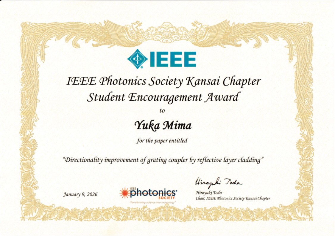 - 大学院生(修士1回生)美馬由佳がIEEE Photonics Society Kansai ChapterからStudent Encouragment Awardを受賞しました。